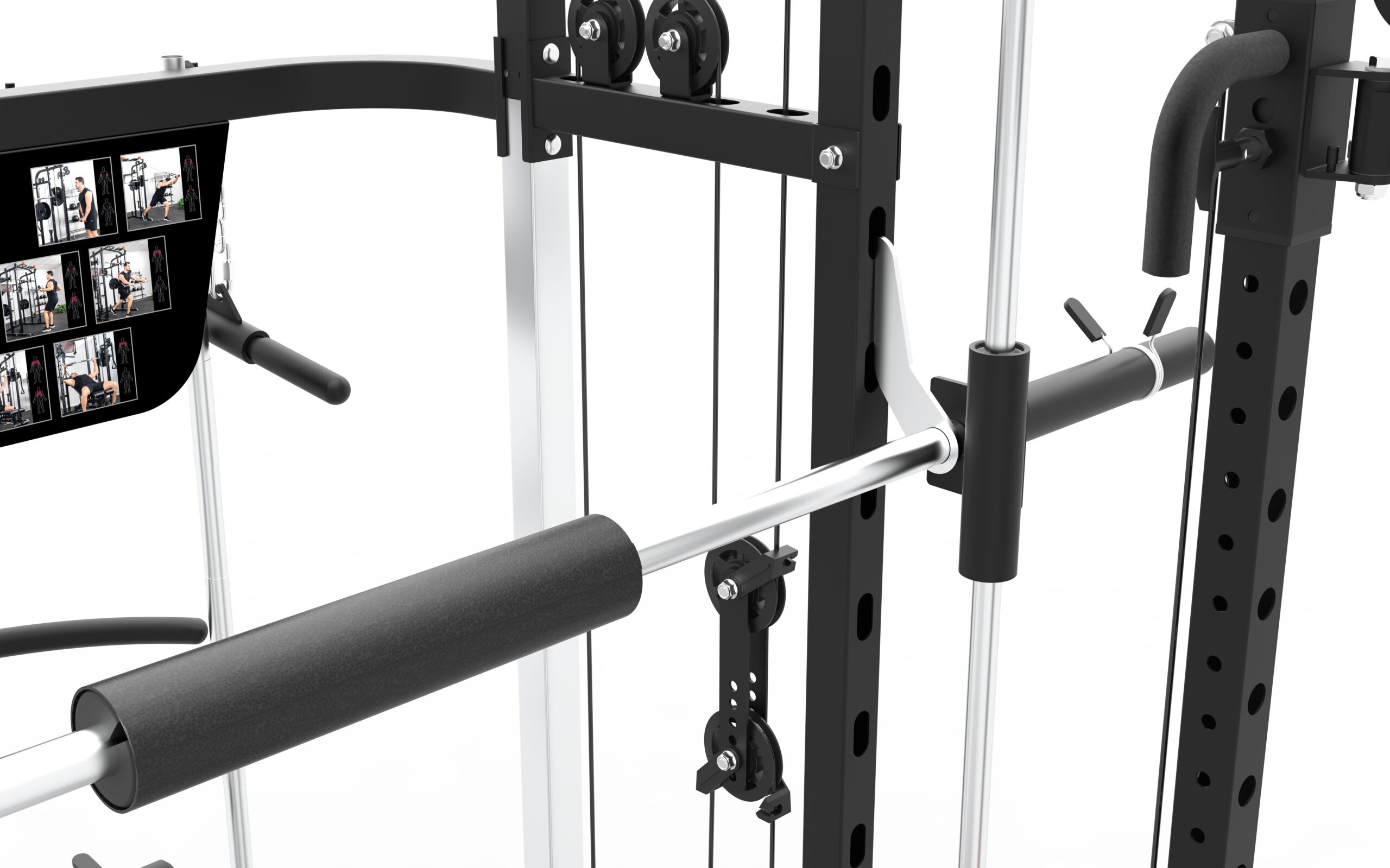 L’ASX-90 offre un’ampia dotazione di accessori che ne fa un vero centro di allenamento: squat bar, 2 J-hooks, coppia di fermi di sicurezza bilanciere, barbell storage, barra trazioni multipresa, 4 ganci per fasce elastiche, 8 porta dischi (ø50 mm e ø25 mm), 12 ferma dischi a molla ø49 mm e 4 ø25 mm. A ciò si aggiungono numerosi attachments inclusi: cavigliera, corda doppia per tricipiti, catena, landmine, 2 maniglie per trazioni, barra lat e barra corta dritta.