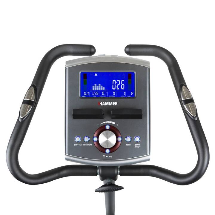 La console della bici da camera Hammer Ergo-Motion BT ha un display LCD che mostra costantemente il tempo, la distanza, la velocità, le calorie e le pulsazioni, rilevate tramite gli appositi sensori manuali Hand Pulse, posti sul manubrio oppure, per una rilevazione più accurata, tramite apposita fascia cardio, non inclusa, ricevitore integrato.