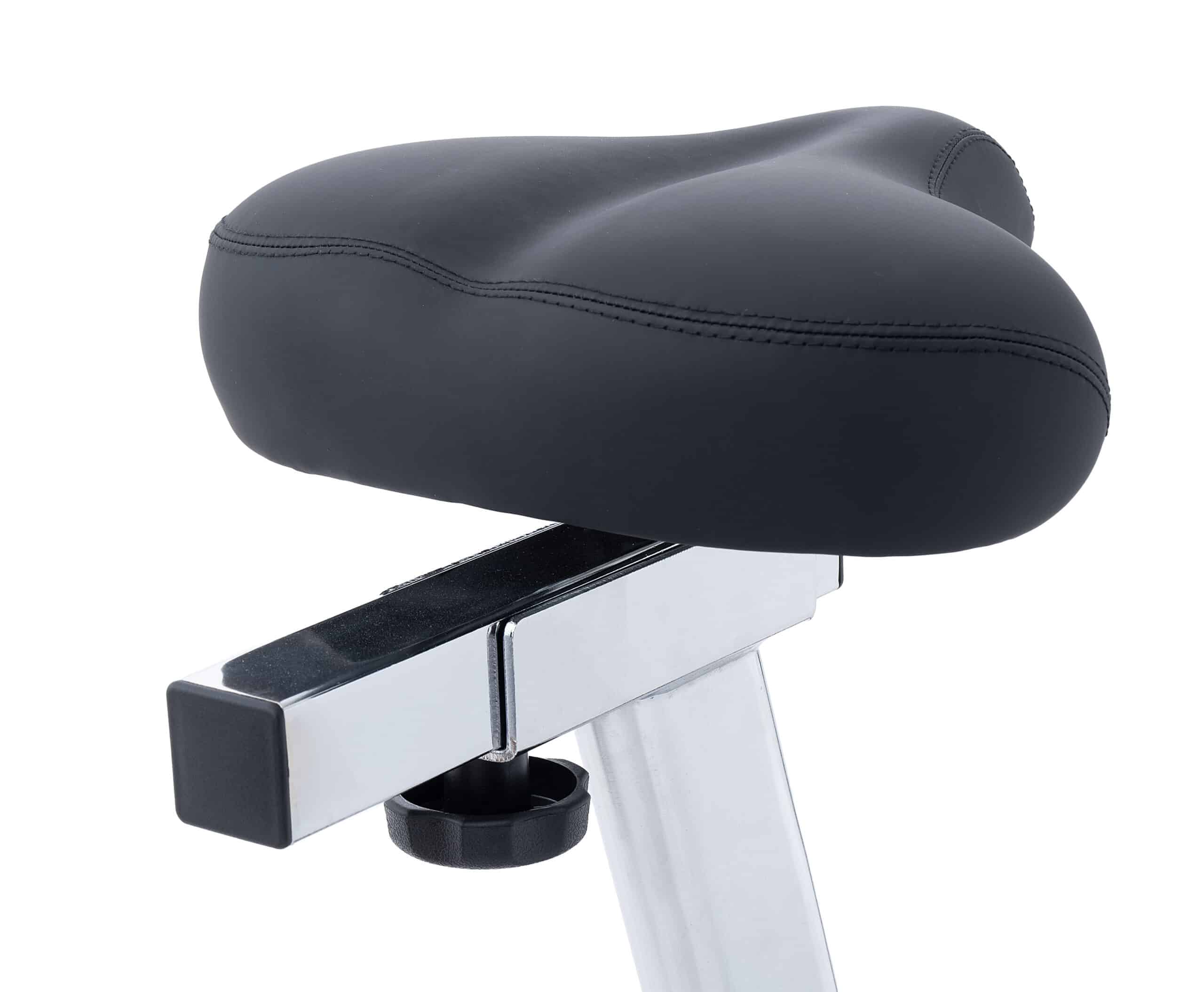 La sella ergonomica con imbottitura a compressione graduata è regolabile in verticale su 10 altezze, così da variare l’altezza sella-pedale tra i 63 e i 95 cm. Anche il manubrio è ergonomico e regolabile per una migliore postura durante l’allenamento, inclinandolo in profondità per variare la distanza sella-manubrio tra i 40,5 e i 50,5 cm.