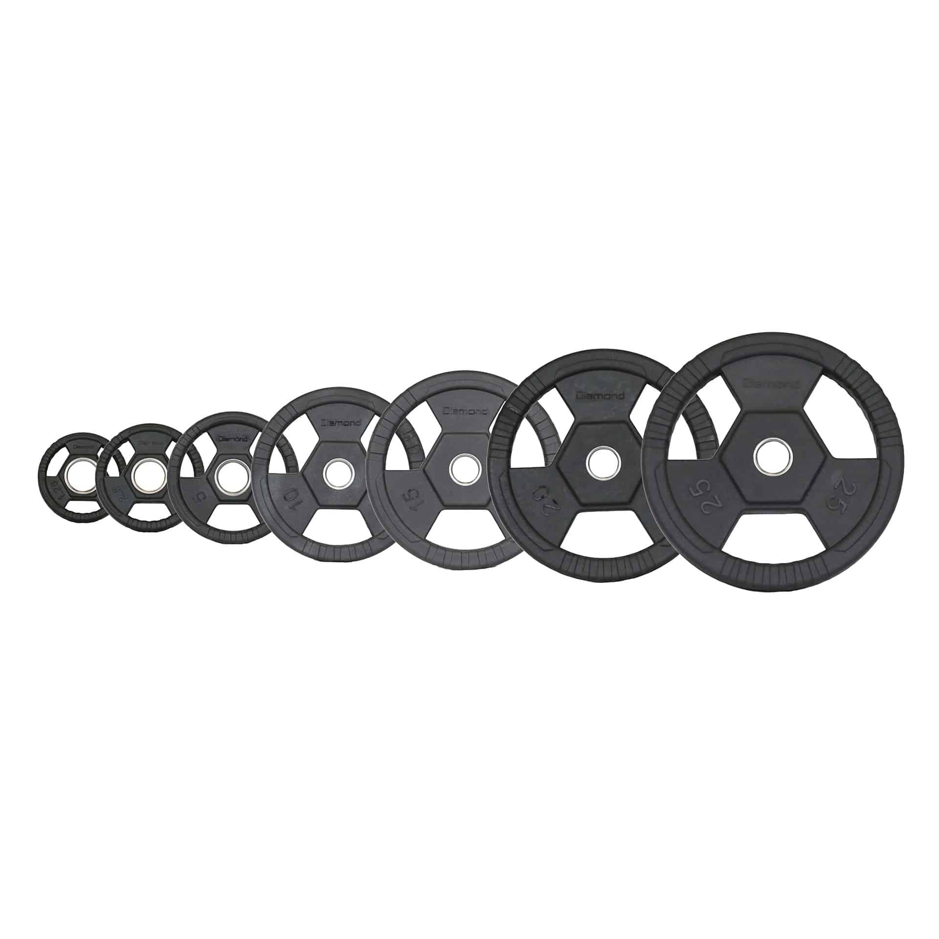 I dischi olimpici sono compatibili con i bilancieri aventi il diametro del manicotto caricabile da 50 mm e sono dotati di una boccola in acciaio inossidabile svasata che protegge dall’usura del contatto con il bilanciere.