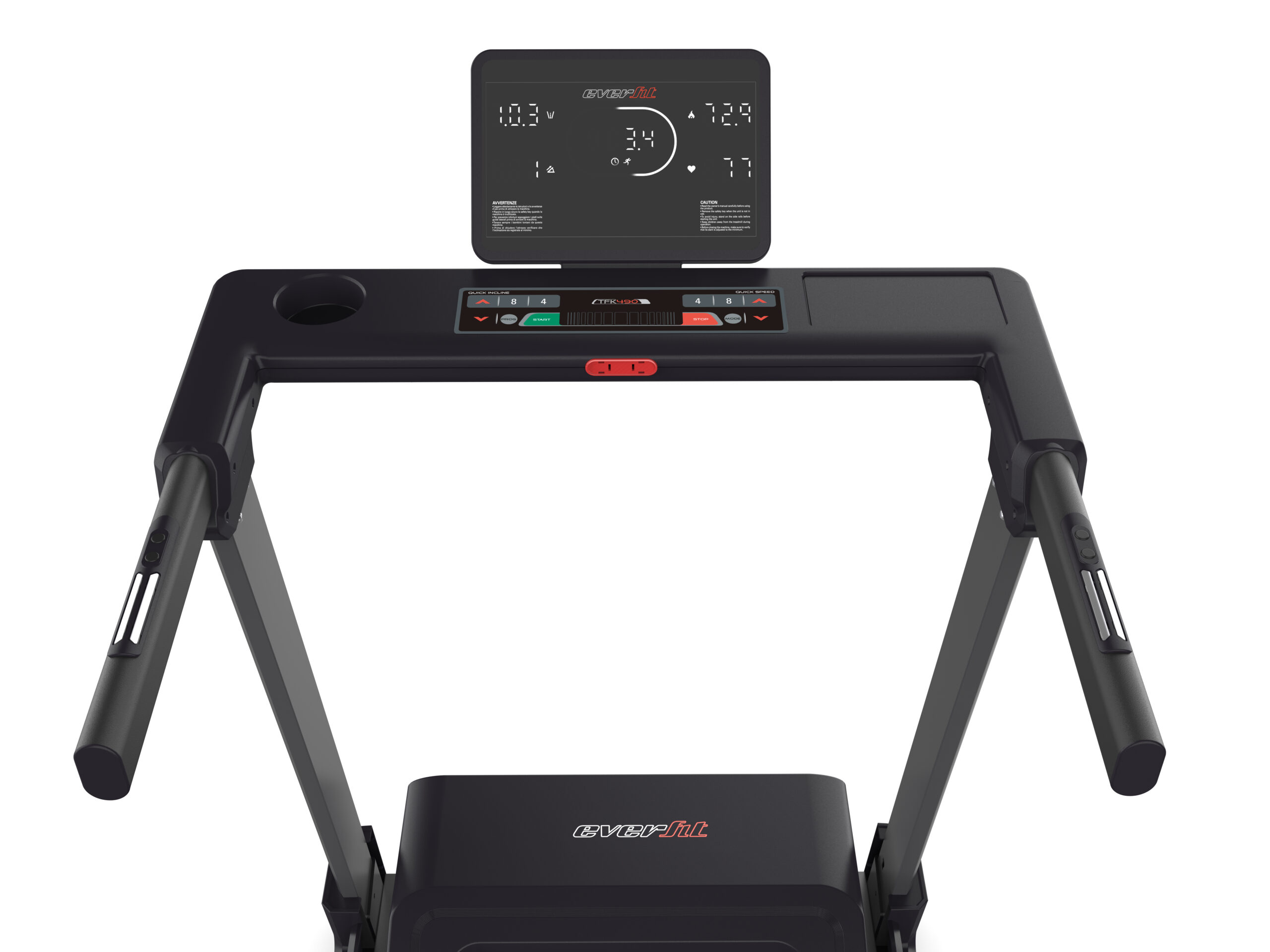 La console con display LED mostra chiaramente velocità, distanza, tempo, calorie, frequenza cardiaca e livello di inclinazione. Sono disponibili 24 programmi preimpostati, 3 user personalizzabili, 3 HRC e il Body Fat Tester, per variare le sessioni e monitorare i progressi in maniera completa.