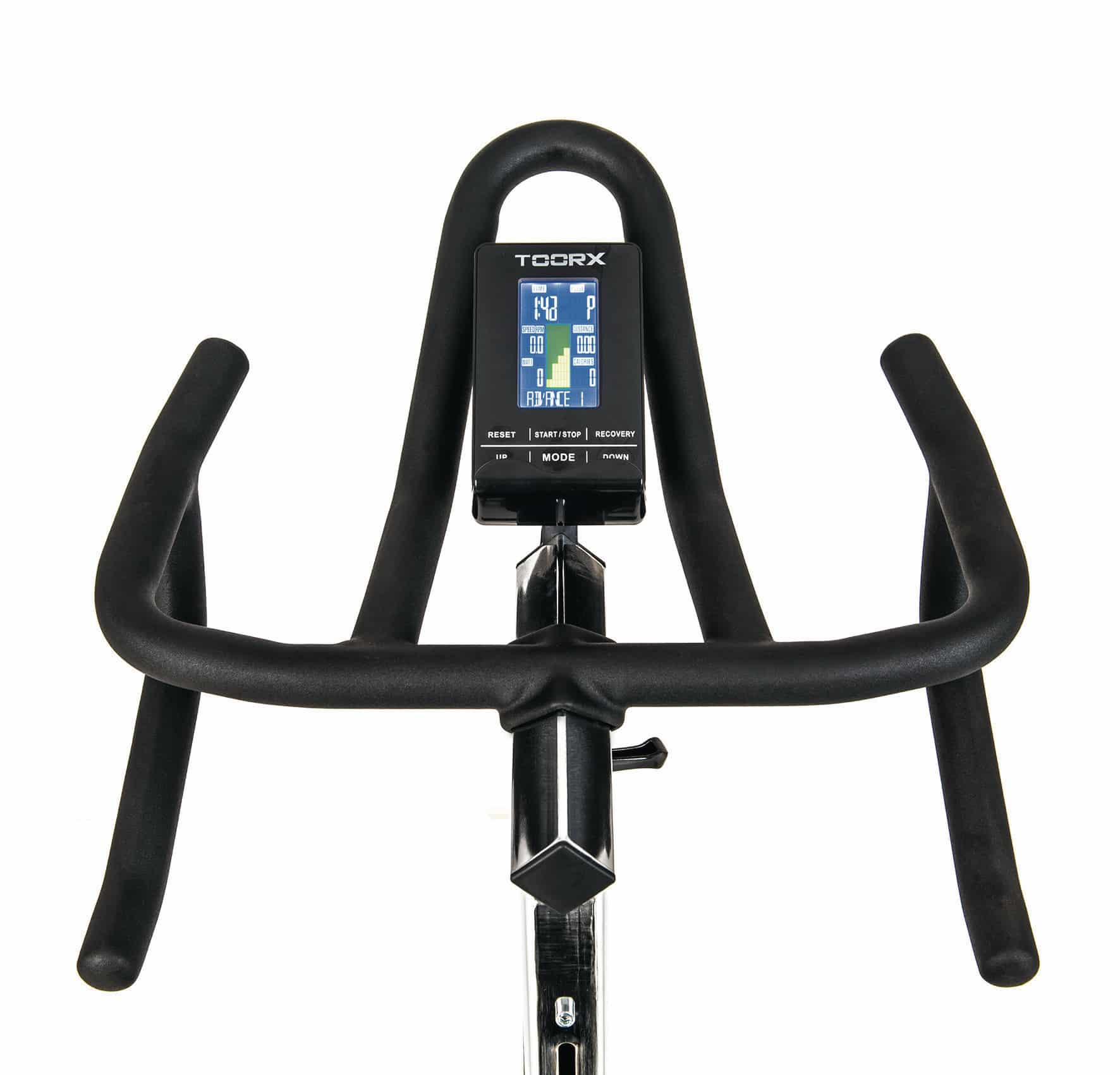 La Gym Bike Toorx SRX 3500 ha in dotazione una console con ampio display LCD che mostra costantemente il tempo, la distanza, la velocità, le calorie, gli RPM e le pulsazioni che possono essere rilevate tramite fascia cardio inclusa.