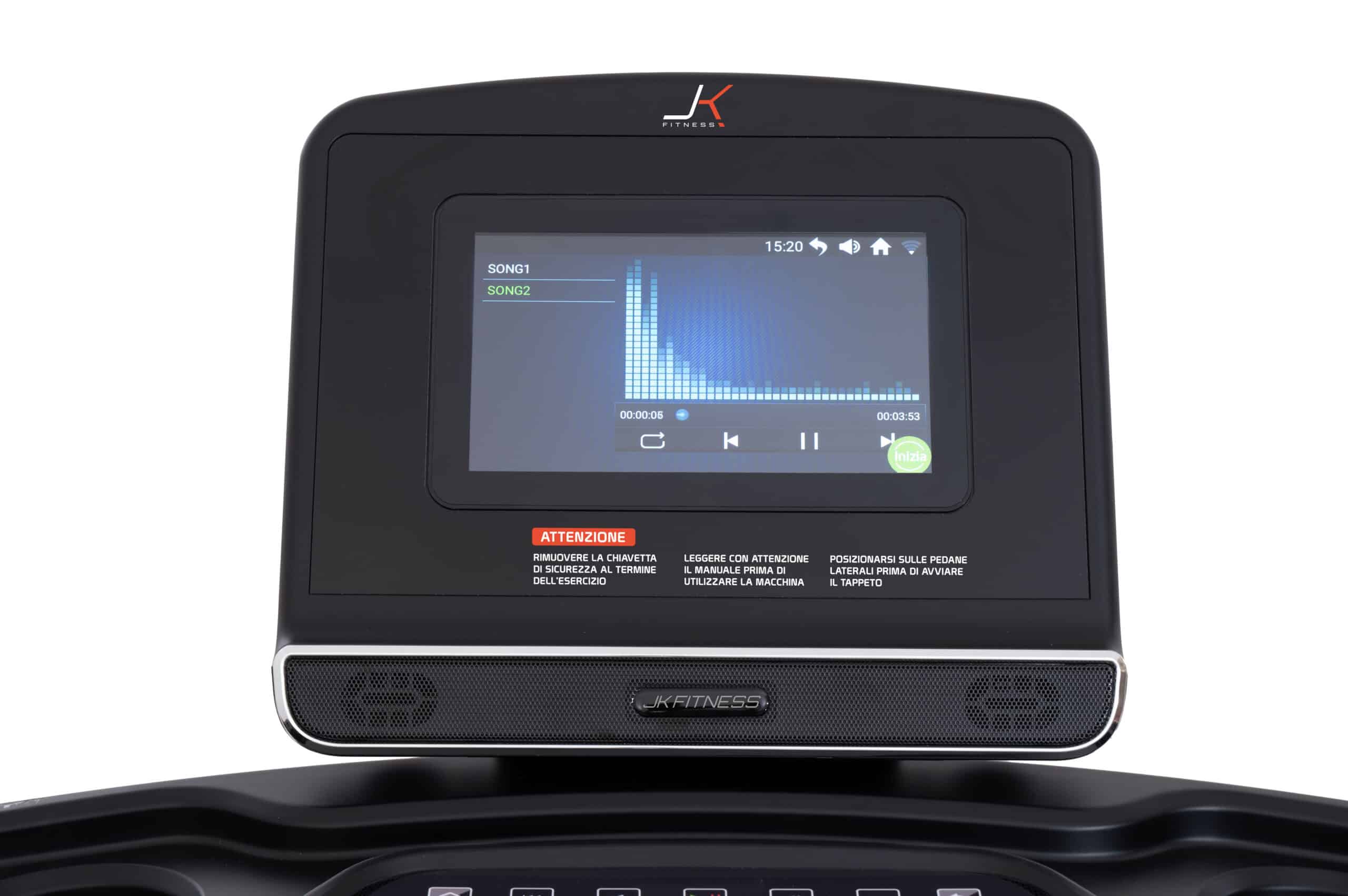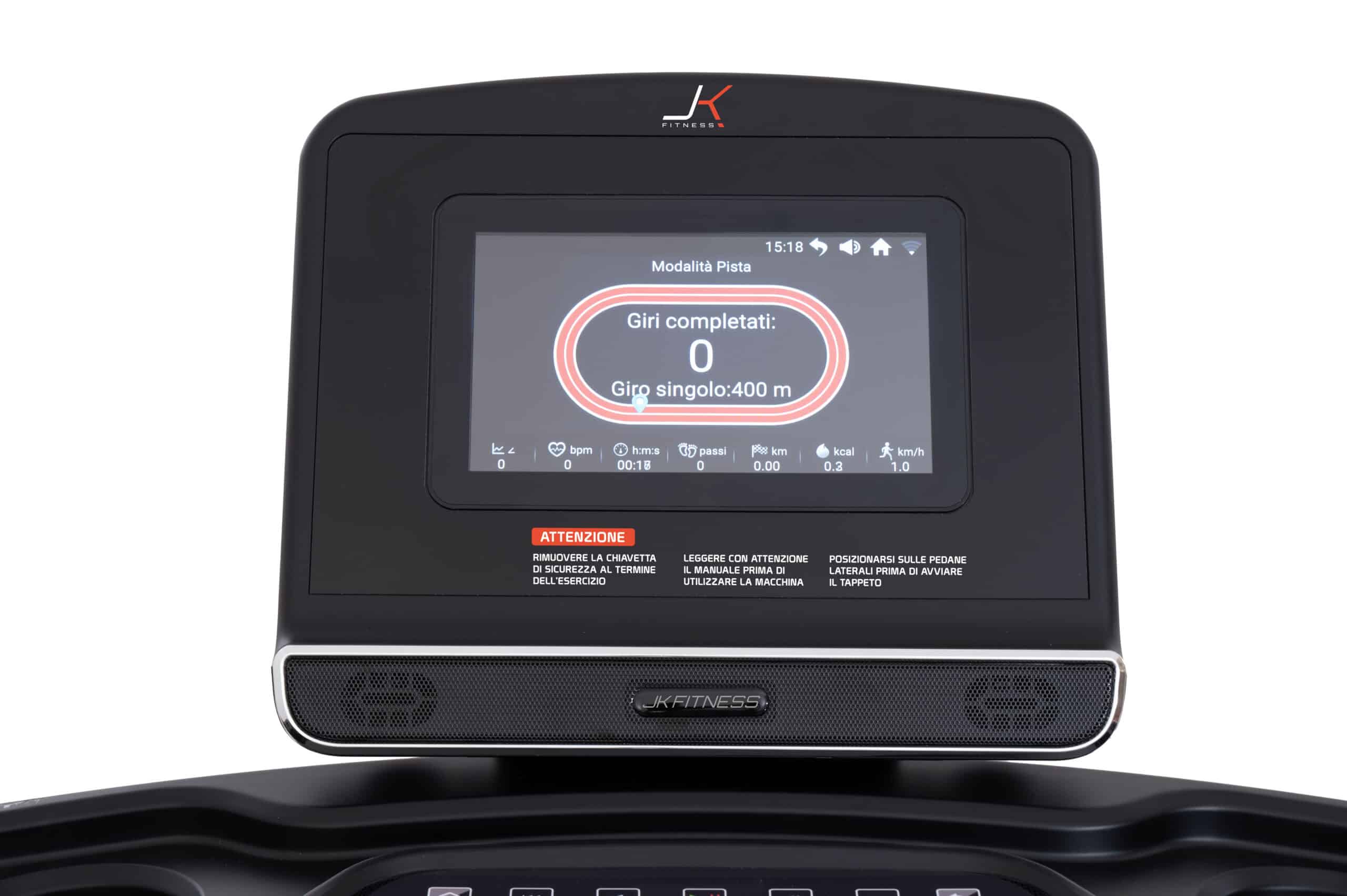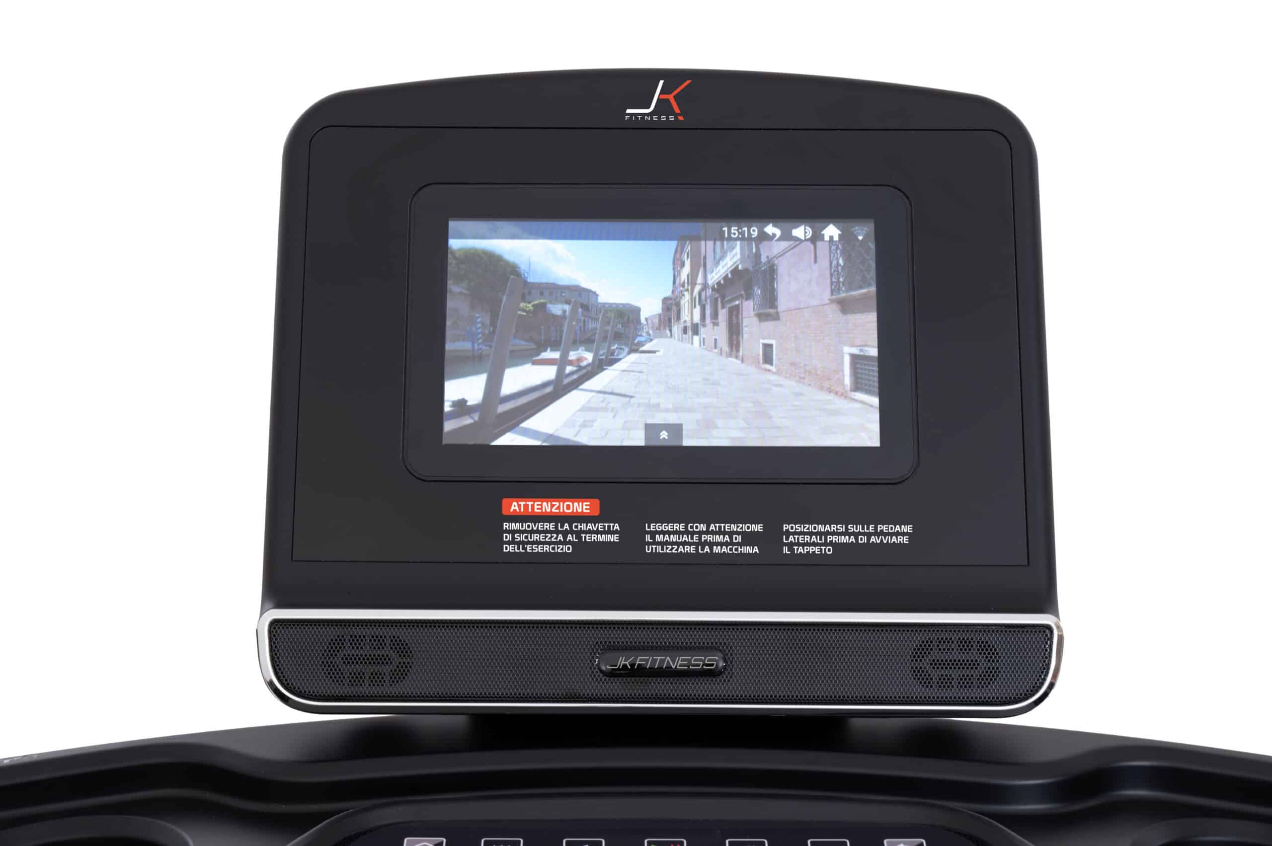 Il quadro di comando del nuovo JK 194 è composto da uno schermo LCD HD da 10”, per mantenere sotto controllo tutti i parametri dell’allenamento cardio quali: tempo, distanza, velocità, inclinazione, calorie bruciate, n° passi, frequenza cardiaca; inoltre, l’ampio touch-screen enfatizza con video di paesaggi reali precaricati, l’allenamento a casa, dando la sensazione di essere “all’aperto”!