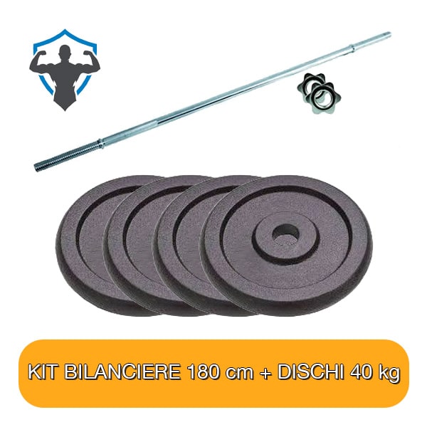 Il kit si compone di un bilanciere 180 cm dal diametro di 25 mm ed ha due chiusure a vite per stringere i pesi sul bilanciere. Il set di pesi da palestra in ghisa da 40 kg è suddiviso in: