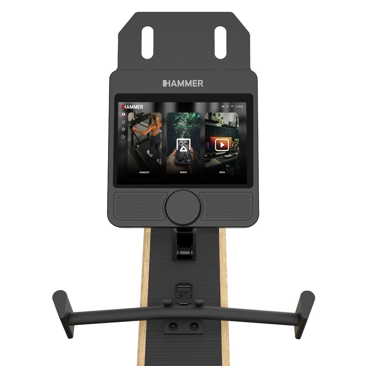 Il cuore tecnologico del vogatore è il display touch TFT da 10,1″, un vero centro di controllo che eleva l’allenamento a un livello superiore. L’interfaccia touchscreen consente di gestire tutte le funzioni con estrema semplicità tramite toccare, spingere e girare, offrendo accesso immediato a programmi di allenamento, dati di performance e intrattenimento multimediale. Grazie alla connettività Bluetooth e Wi-Fi, il sistema supporta app come Kinomap, HAMMER Workouts, Zwift e piattaforme di intrattenimento come Netflix, Spotify, YouTube e Disney, permettendo di allenarsi mentre si guarda un film, si ascolta musica o si seguono percorsi virtuali realistici.