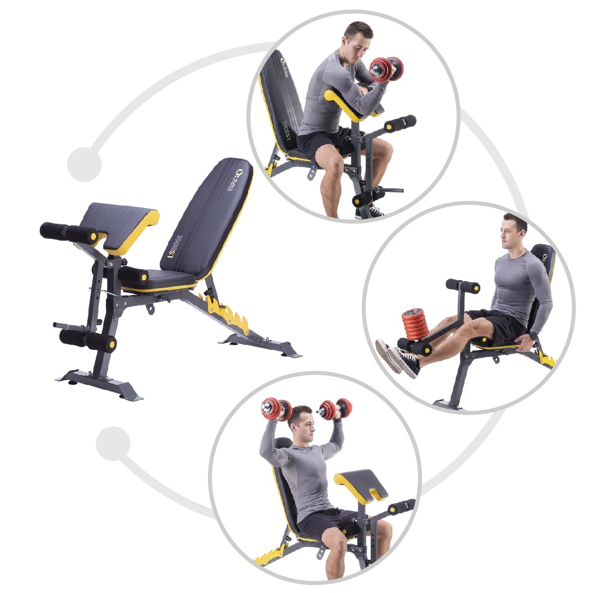 La LS3061 include inoltre un preacher curl (panca Scott) rimovibile, ideale per l’allenamento dei bicipiti. Rimuovendo questo elemento, la panca si trasforma in una vera e propria leg extension e leg curl station, perfetta per tonificare quadricipiti e muscoli posteriori delle cosce. La panca supporta un carico massimo complessivo di 270 kg e fino a 180 kg sulla sezione gambe (leg extension).