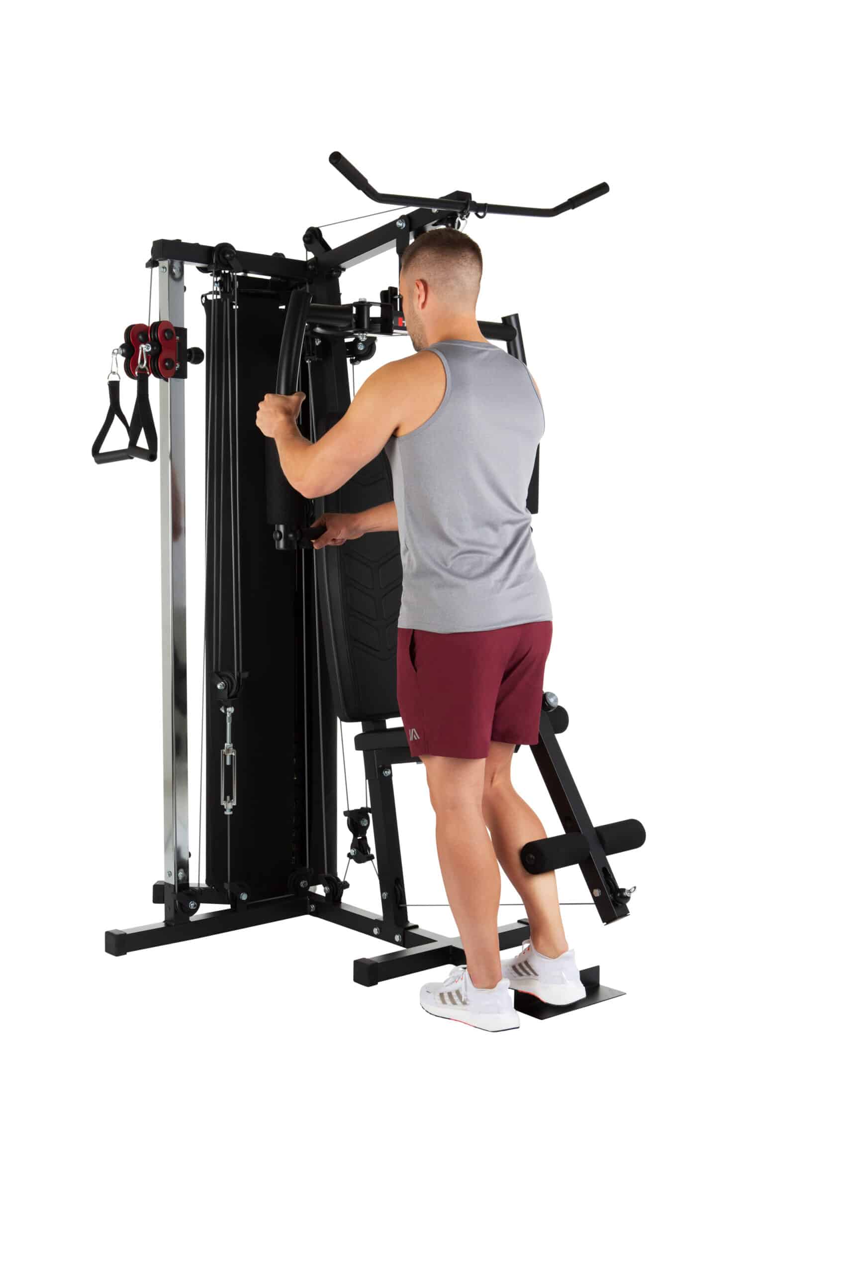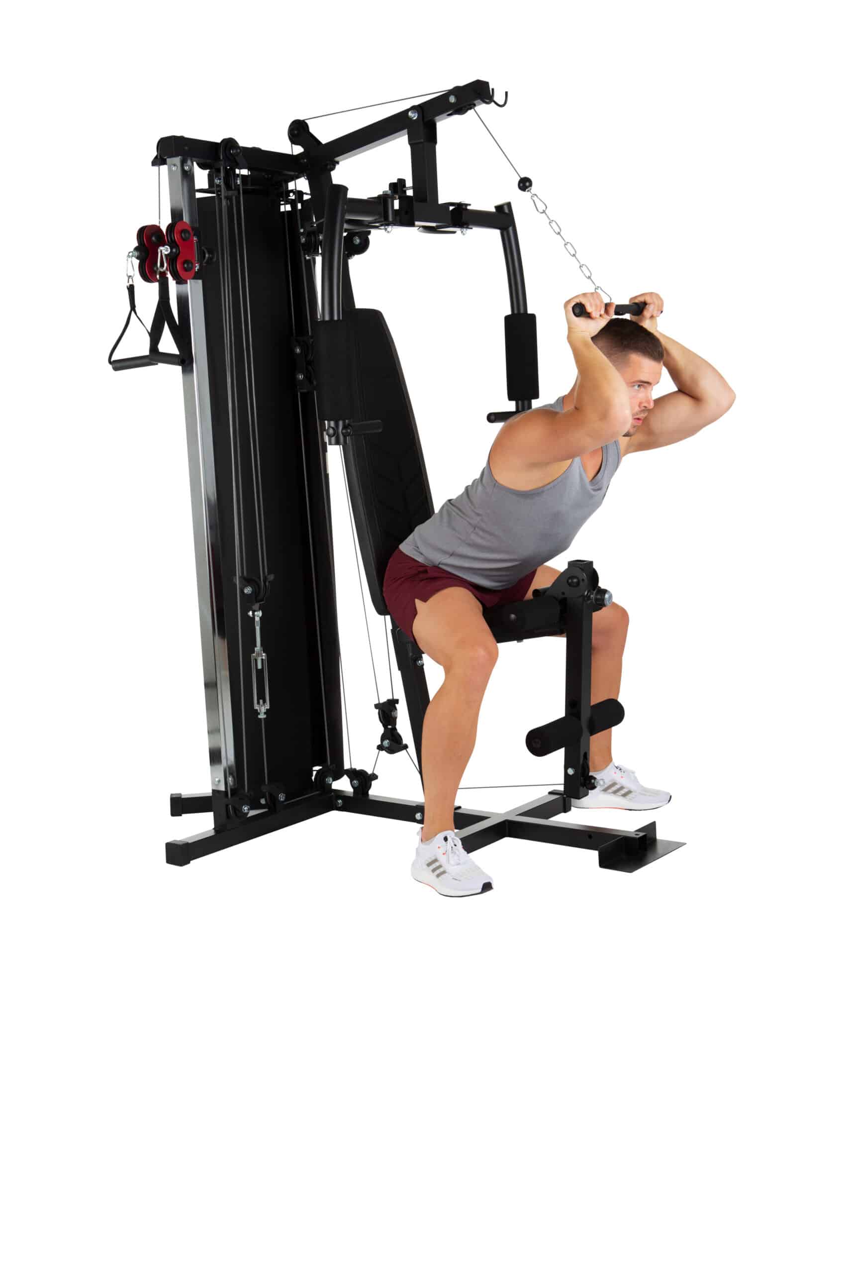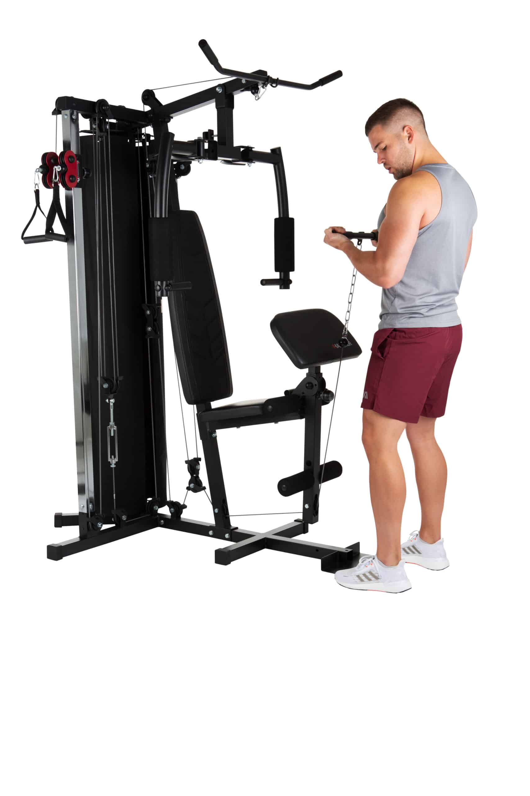 Puoi facilmente sviluppare muscoli delle braccia (bicipiti e tricipiti) con la stazione di curling – l’altezza della quale può essere regolata – una barra di curling e una puleggia per tricipiti.
