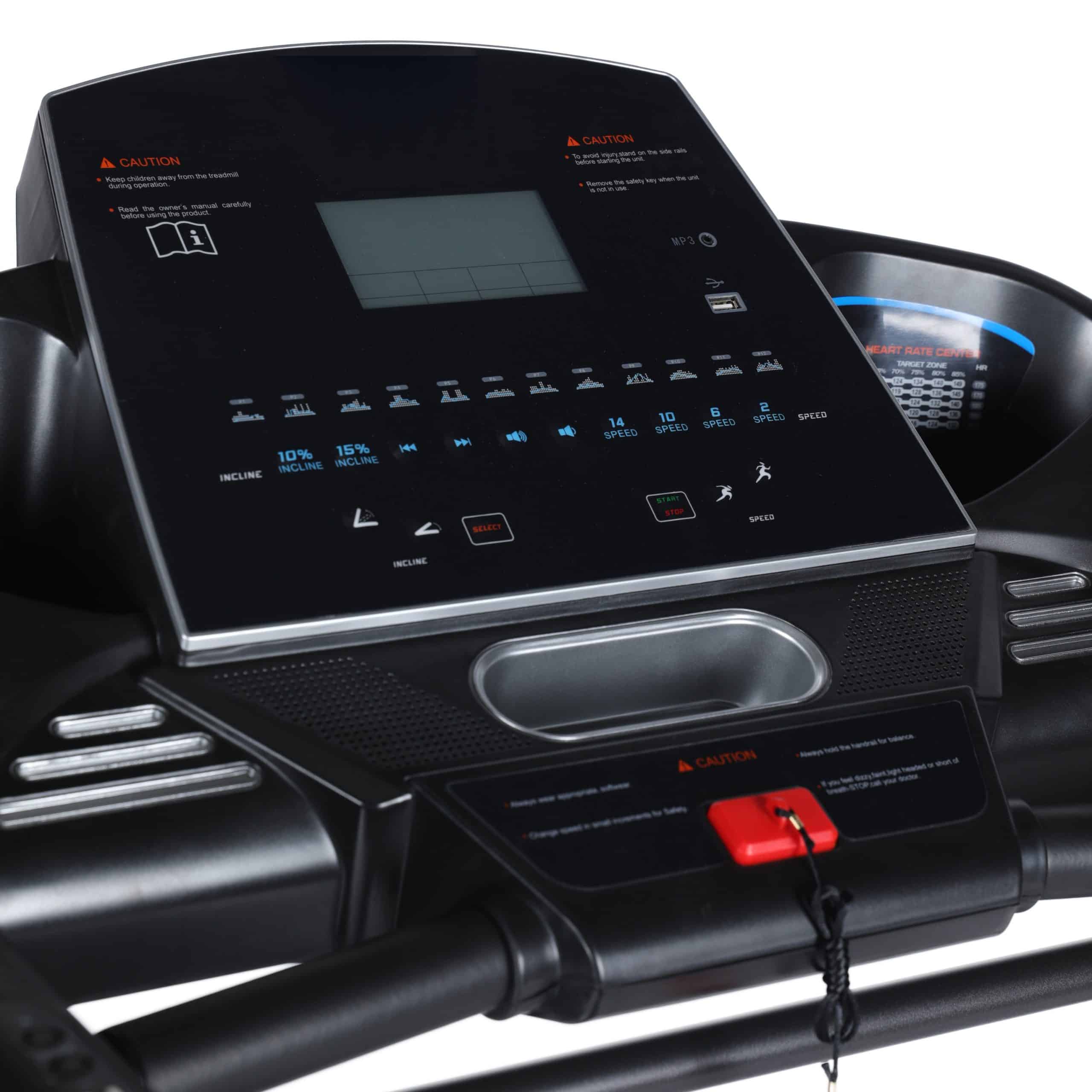 L’inclinazione è elettrica e si può regolare dalla console tramite pulsanti su 15 livelli di inclinazione. Inoltre, dalla console è possibile regolare la velocità e tenere sotto controllo i dati di allenamento (velocità, tempo, pulsazioni, distanza, calorie consumate), che si possono leggere dal display LED sopra ai comandi.