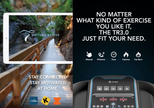 Il tapis roulant TR 3.0 Horizon ha un display con 3 finestre LED per monitorare continuamente distanza, calorie, tempo velocità e frequenza cardiaca. Dalla consolle è possibile selezionare uno dei 35 programmi, tra cui Manuale, Distanza (1.6K, 3,2K, 5k, 8k, 10k, 12,8K, 15k, 16K, 20k, mezza maratona, 24K, 32K e obiettivi maratona), Tempo x 10 livelli, Calorie, Brucia grassi x 10 livelli.