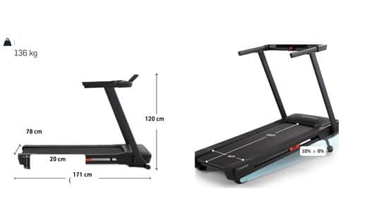 Dalla superficie di corsa di 46 x 140 cm, il tapis roulant prevede un’ammortizzazione KeyFlex™, che assorbe gli impatti durante la camminata e la corsa. Può supportare un utente fino a 136 kg e le dimensioni del prodotto sono di 171 x 78 x 120 cm (lunghezza x larghezza x altezza). Il tapis roulant non è richiudibile.