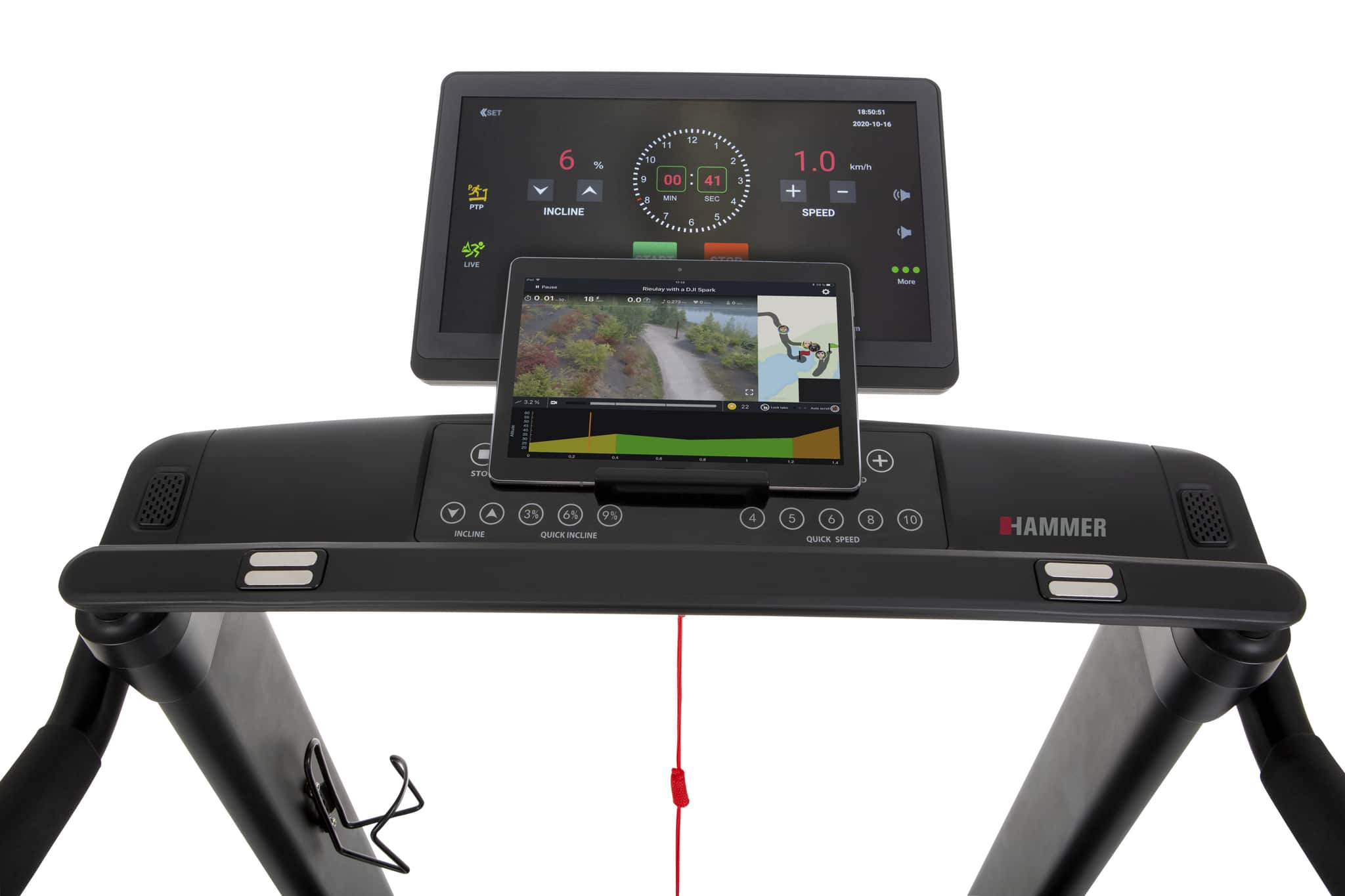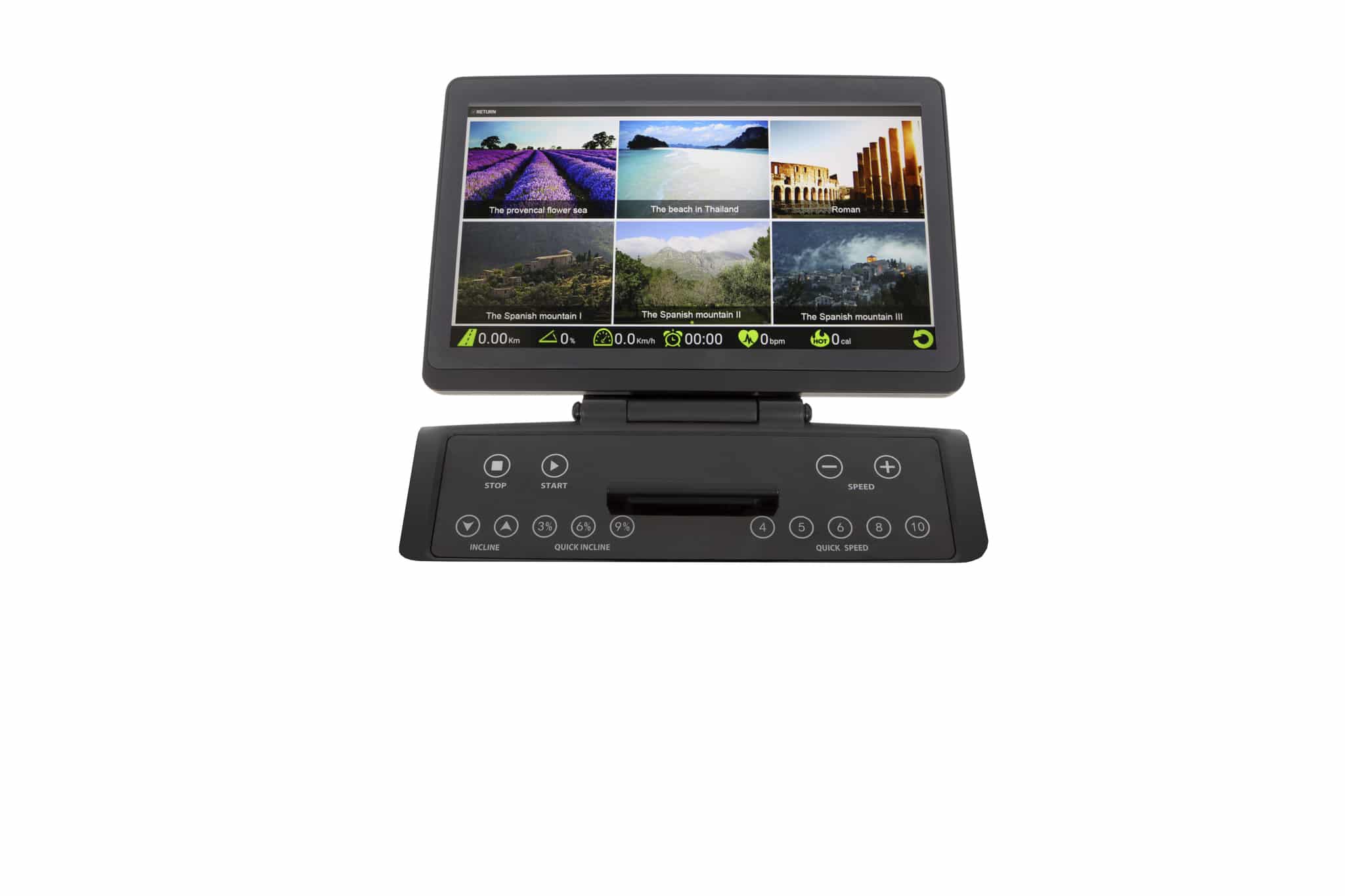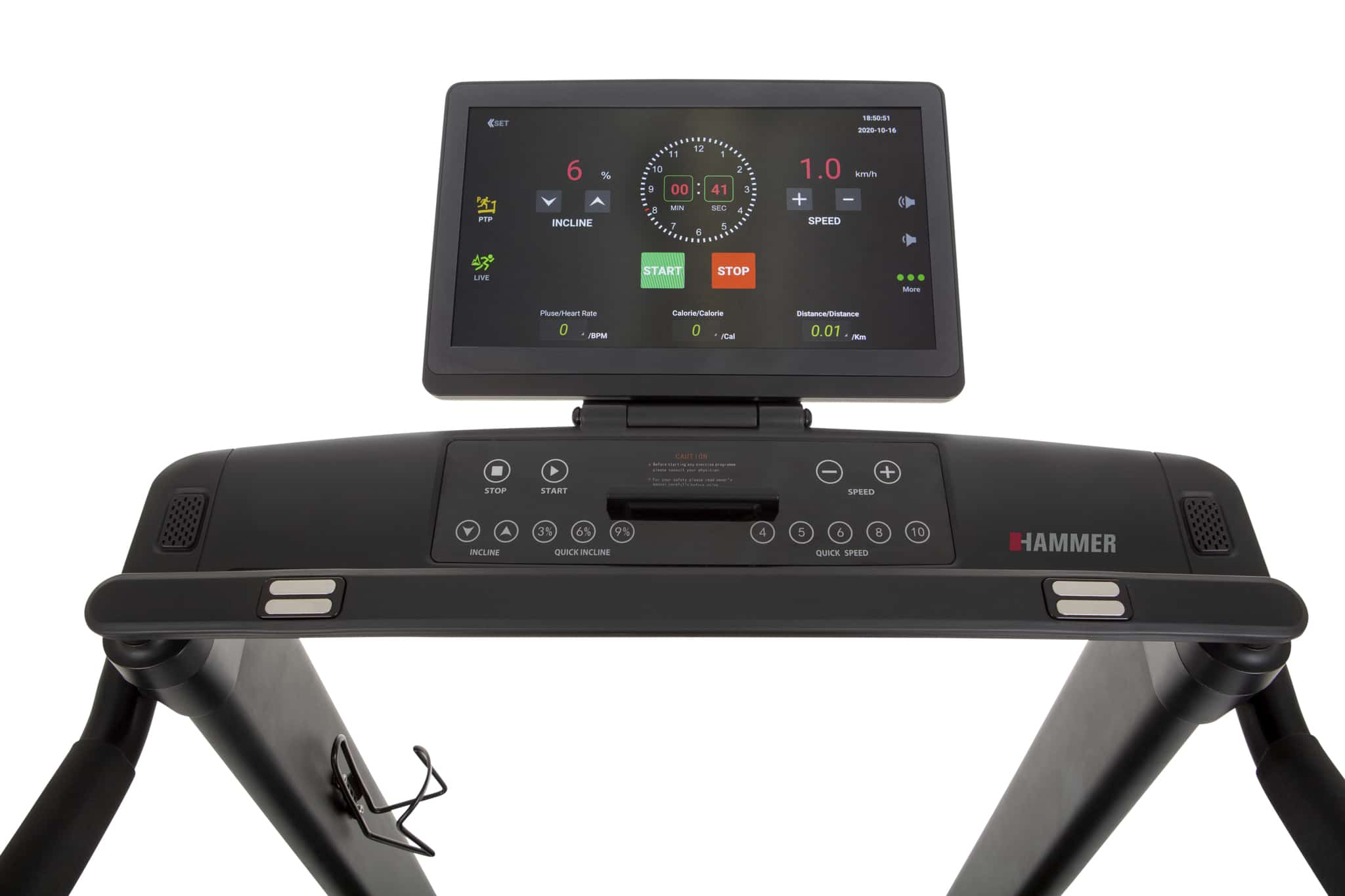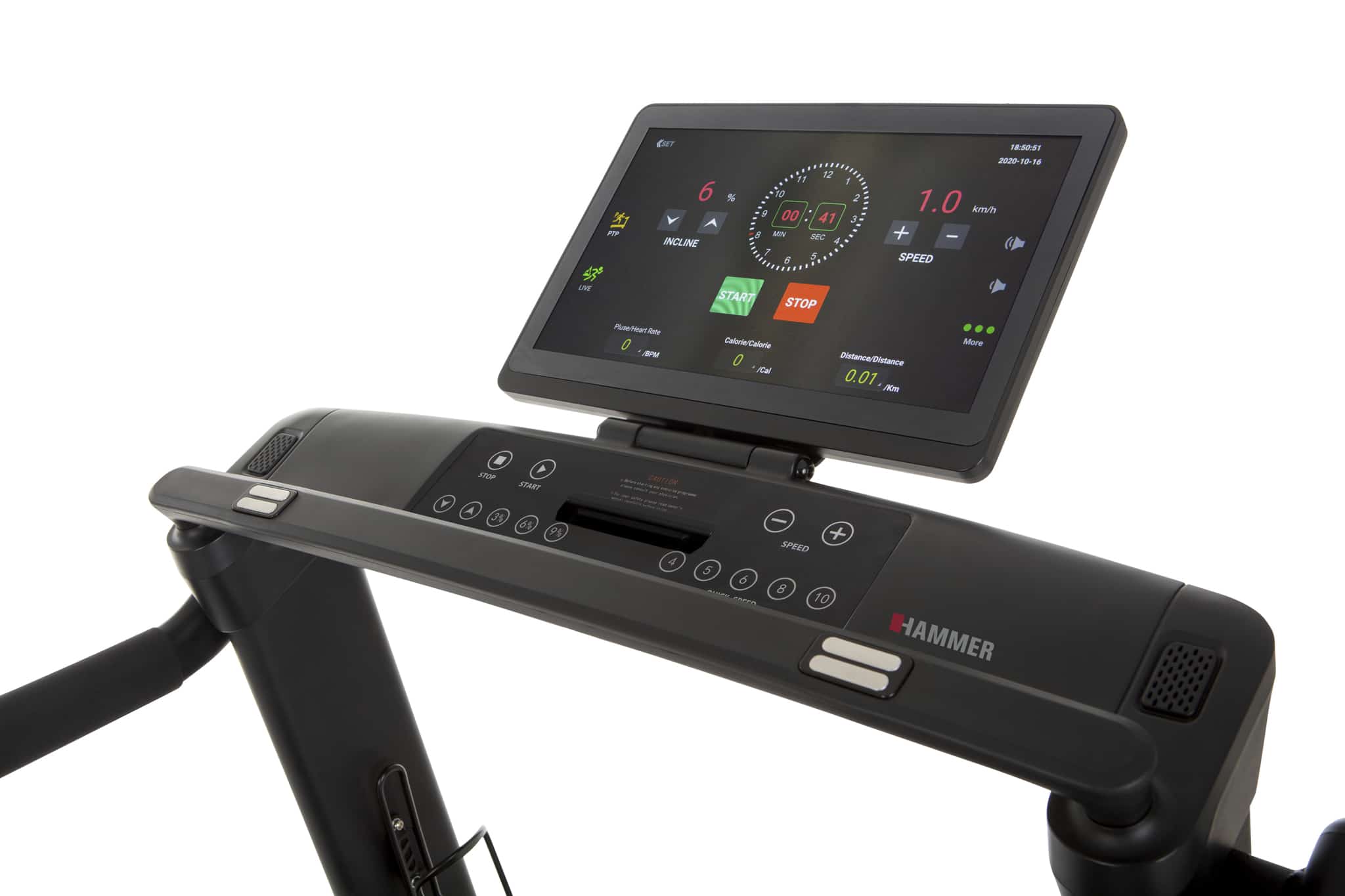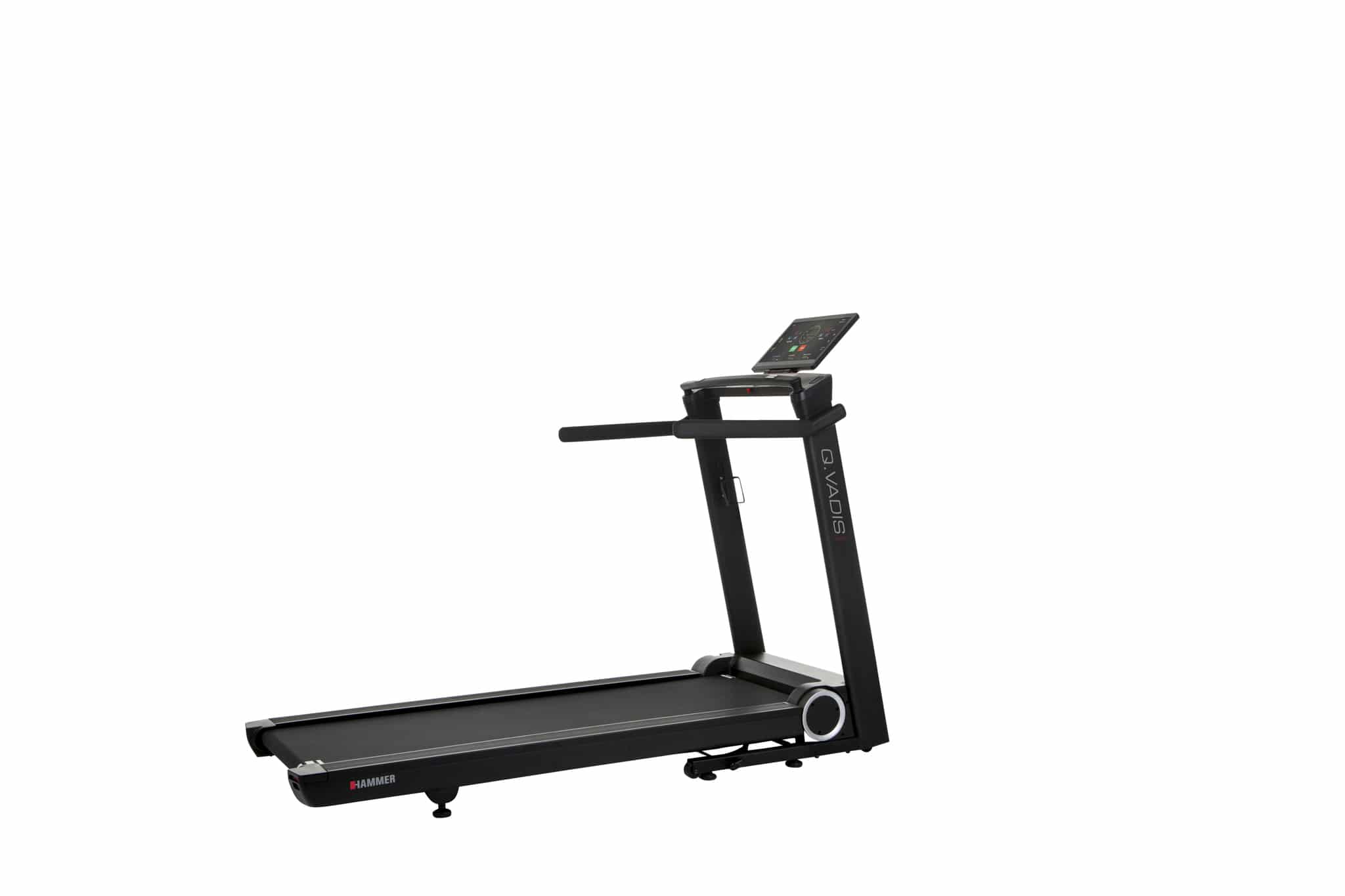 Il tapis roulant salvaspazio Q. Vadis 10.0 di Hammer è un concentrato di tecnologia e prestazioni, progettato per offrirti un’esperienza di allenamento avanzata direttamente a casa tua. Dotato di un ampio display TFT touch da 15,6″, questo tapis roulant ti offre un’interfaccia intuitiva e interattiva per controllare e monitorare ogni aspetto della tua sessione di allenamento.